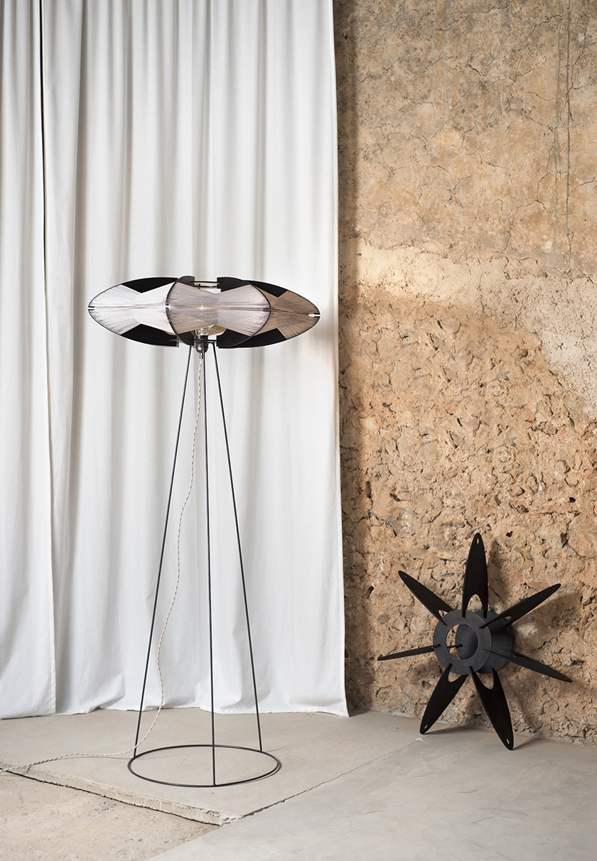 TypeFloor lamp. Pendant version is also available.MaterialsRaw metal, lasercut wood, 7 yarns cotton cordDimensionsDiam. 70cm Year2019CreditsNeus Pastor